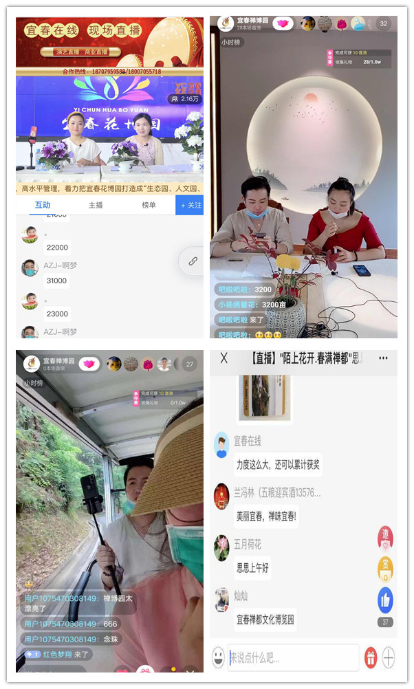 為加大宣傳推廣,“五一”小長假假期,我司利用宜春在線、禪博園、花博園抖音等網(wǎng)絡(luò)平臺,開展直播宣傳營銷。5月1、2日兩園以“陌上花開.春滿禪都”和“植物世界,花藥魔法”為主題,共計開展了4場次游園直播和直播間直播。直播主播們詳細(xì)地向網(wǎng)友們介紹了兩園的景點,并不時開展答題搶年卡活動,網(wǎng)友們積極互動,踴躍答題,參與直播的互動人數(shù)達(dá)到5.74萬人次。