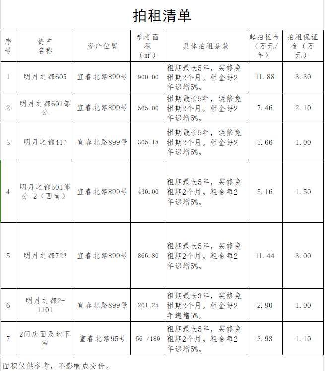 一、拍租標(biāo)的:宜春北路899號(hào)明月之都部分資產(chǎn),宜春北路95號(hào)原軍轉(zhuǎn)大廈樓下2間店面及地下室。詳情見(jiàn)本公司拍租清單。