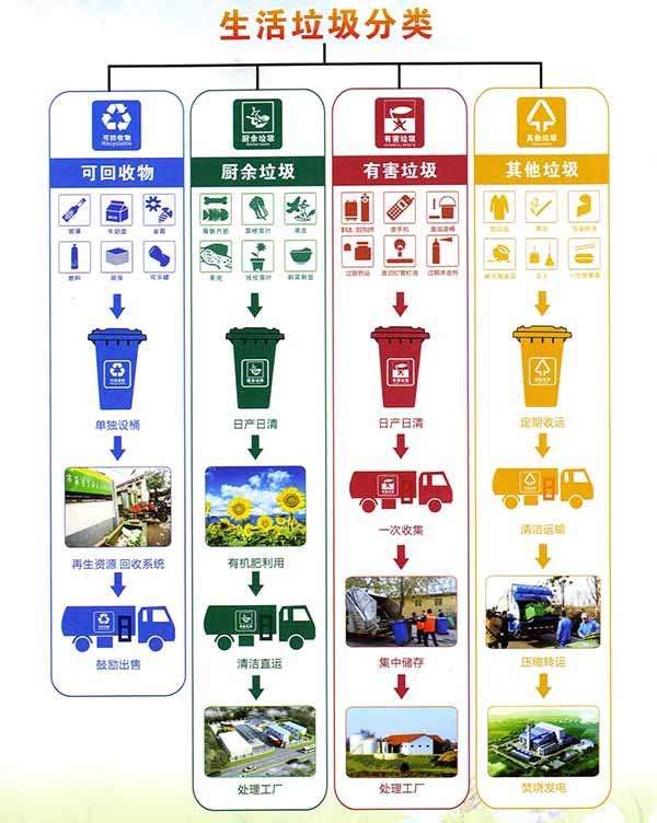 通過分類投放、分類收集,把有用物資,如紙張、塑料、橡膠、玻璃、瓶罐、金屬以及廢舊家用電器等從垃圾中分離出來重新回收、利用,變廢為寶。既提高垃圾資源利用水平,又可減少垃圾處置量,它是實現(xiàn)垃圾減量化、無害化、資源化的重要途徑和手段。