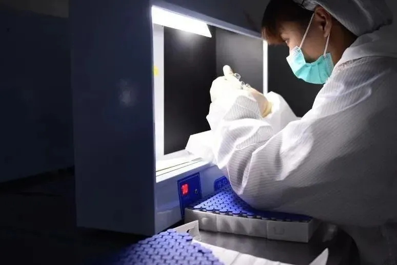 在安徽智飛龍科馬生物制藥有限公司新冠疫苗生產(chǎn)線上,工作人員對(duì)疫苗進(jìn)行人工檢測(cè)。黃博涵攝(新華社)