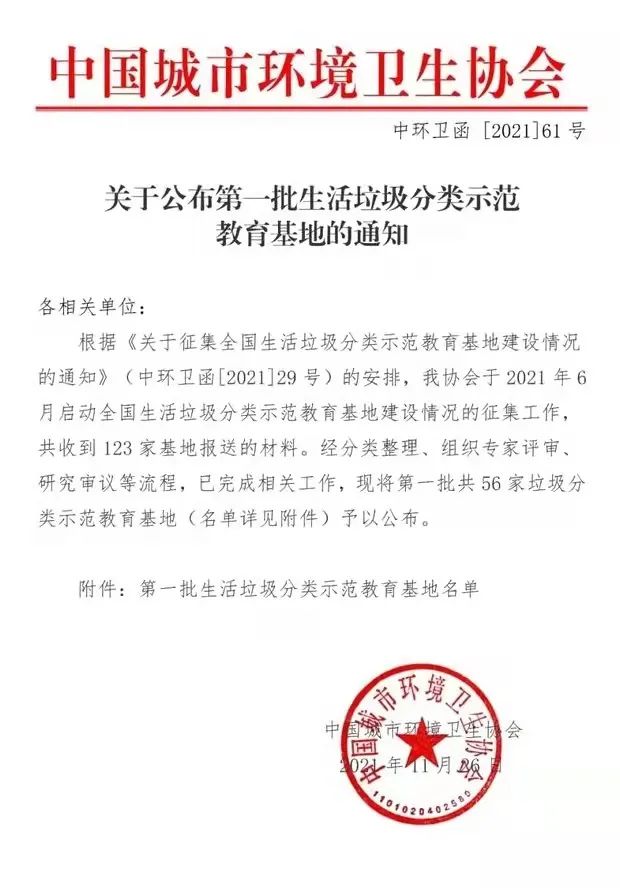 據(jù)悉,中國城市環(huán)境衛(wèi)生協(xié)會于2021年6月啟動全國生活垃圾分類示范教育基地建設(shè)情況的征集工作,共有123家基地參選。經(jīng)分類整理、組織專家評審、研究審議等流程,56家垃圾分類示范教育基地被評為全國首批生活垃圾分類示范教育基地。