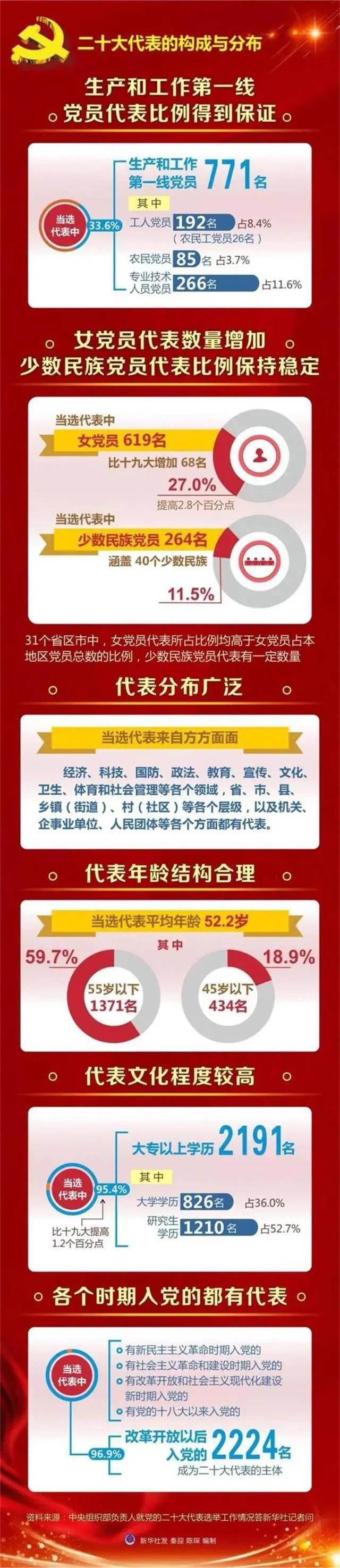 二十大代表應(yīng)具有廣泛代表性,能夠代表和反映各行各業(yè)、各個(gè)方面的黨員意愿。結(jié)構(gòu)合理、廣泛分布,是代表具有廣泛代表性的重要體現(xiàn)。包括要保證生產(chǎn)和工作第一線代表比例;注重推薦工人、農(nóng)民和專業(yè)技術(shù)人員黨員中的先進(jìn)模范人物;女黨員和少數(shù)民族黨員應(yīng)占一定比例;嚴(yán)把人選身份關(guān),防止扣帽子。